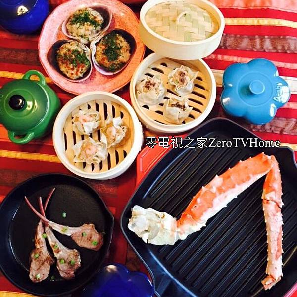今天的主食是羊排、蟹腿、燒賣、焗烤貝殼,另外炒了兩盤蔬菜。